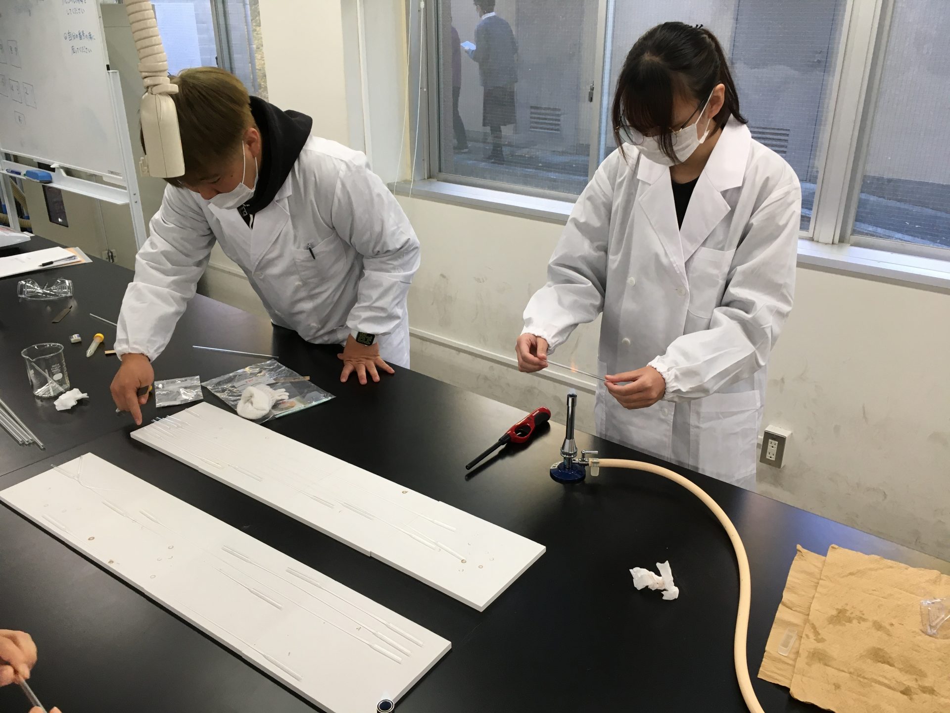 今回は、斉藤先生の担当で、「安全管理と試薬の取り扱い・ガラス細工」を学びました。